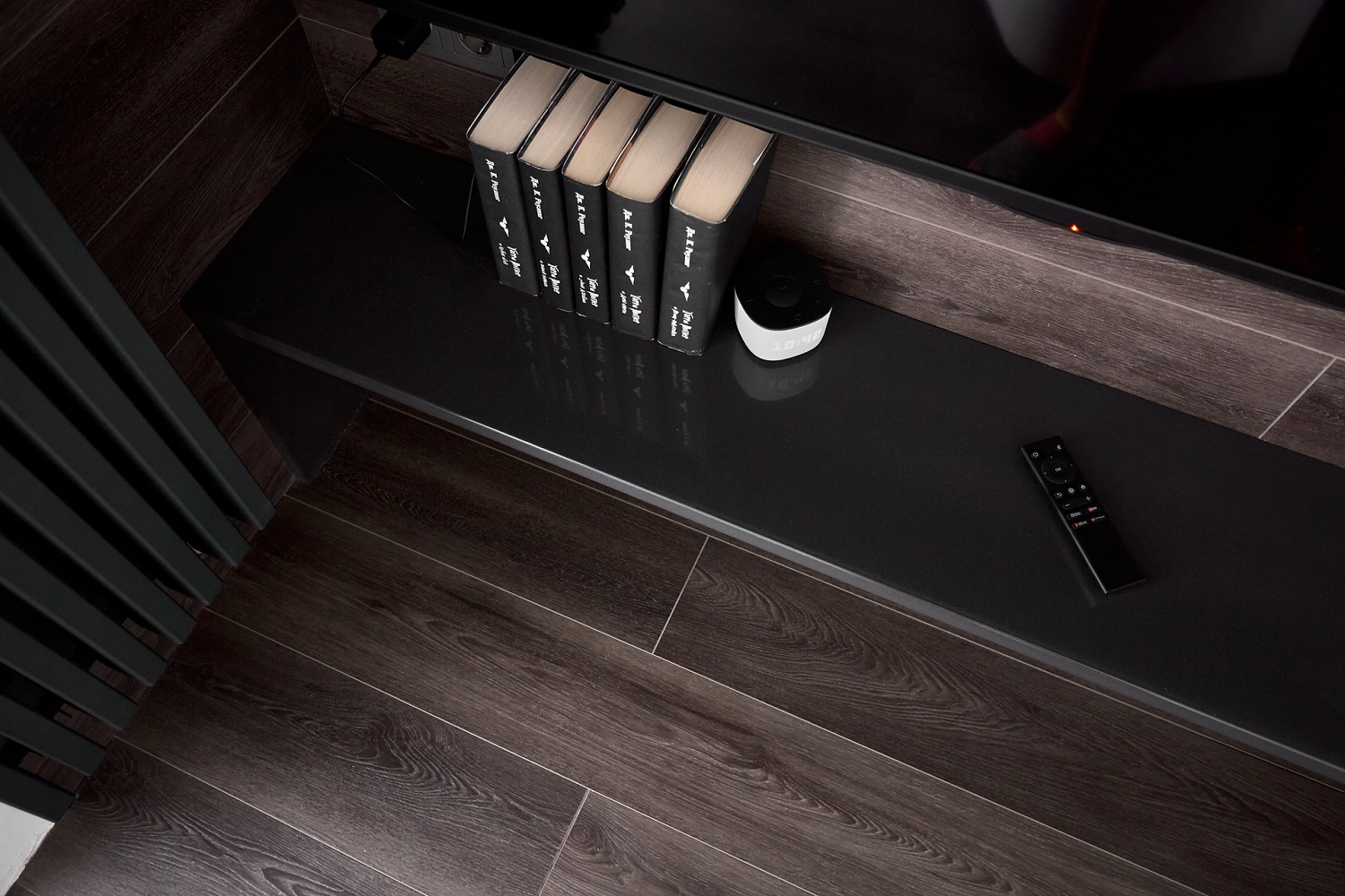 От застройщика был ровный наливной, проблем при укладке не было: сначала положил подложку, потом укладывал кварцевый ламинат. Замки с двух смежных сторон защелкиваются достаточно легко но надёжно, прямые подрезки делал монтажным ножом, фигурные около окна – лобзиком и болгаркой.