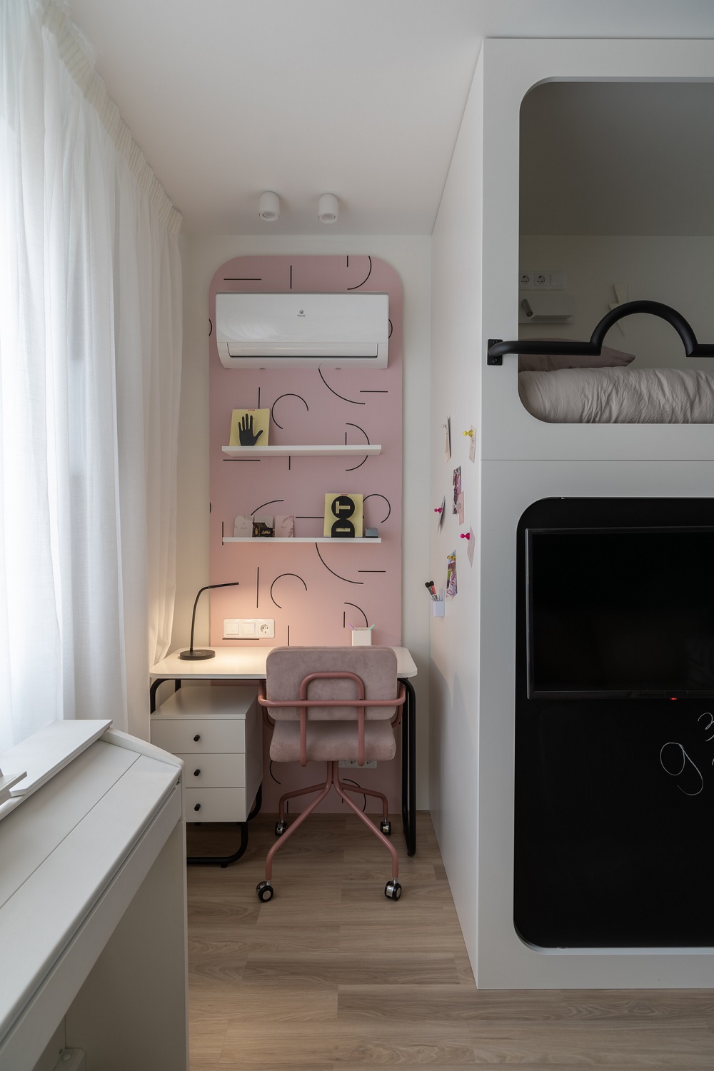 В детской применили интерьерную магию: разделили пространство на спальню, рабочую зону и гардеробную. Кстати, чулан, в котором жил Гарри Поттер, и знаменитые очки здесь тоже появились.